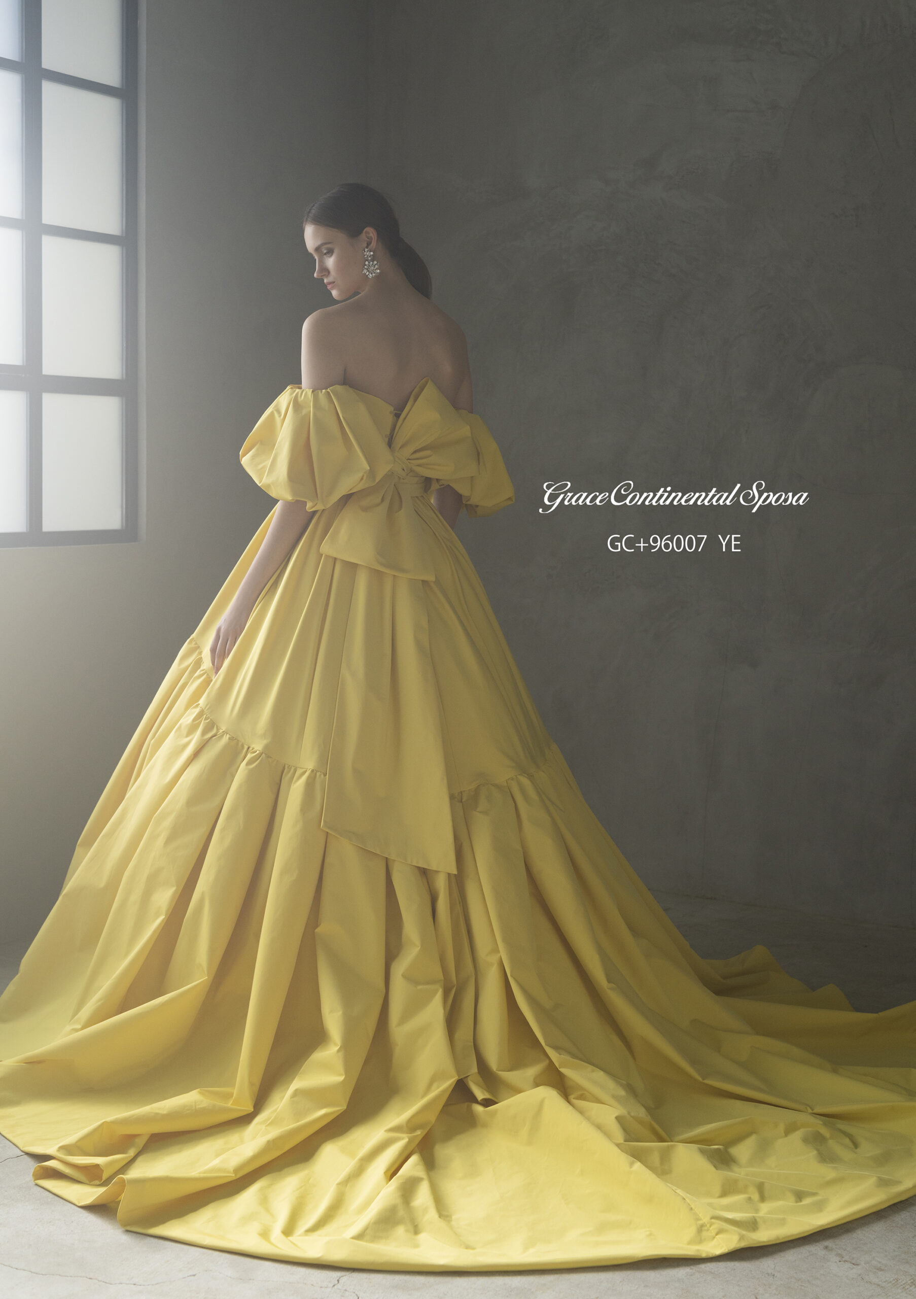 ビッグフォルムのパフスリーブがポイントのモノマテリアルは、色見と素材にこだわって制作したオリジナルタフタを使用しています。スカートはティアードで切替をいれて、シンプルデザイン性を高めたモードなカラードレスです。