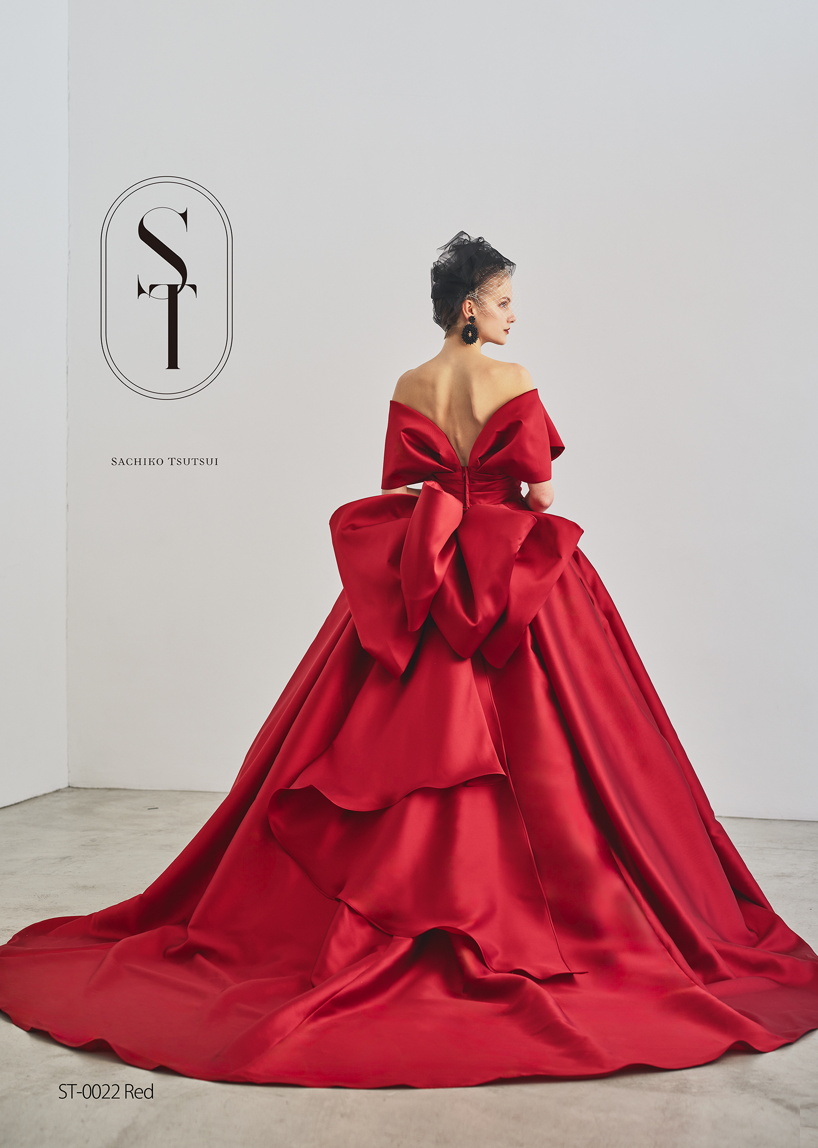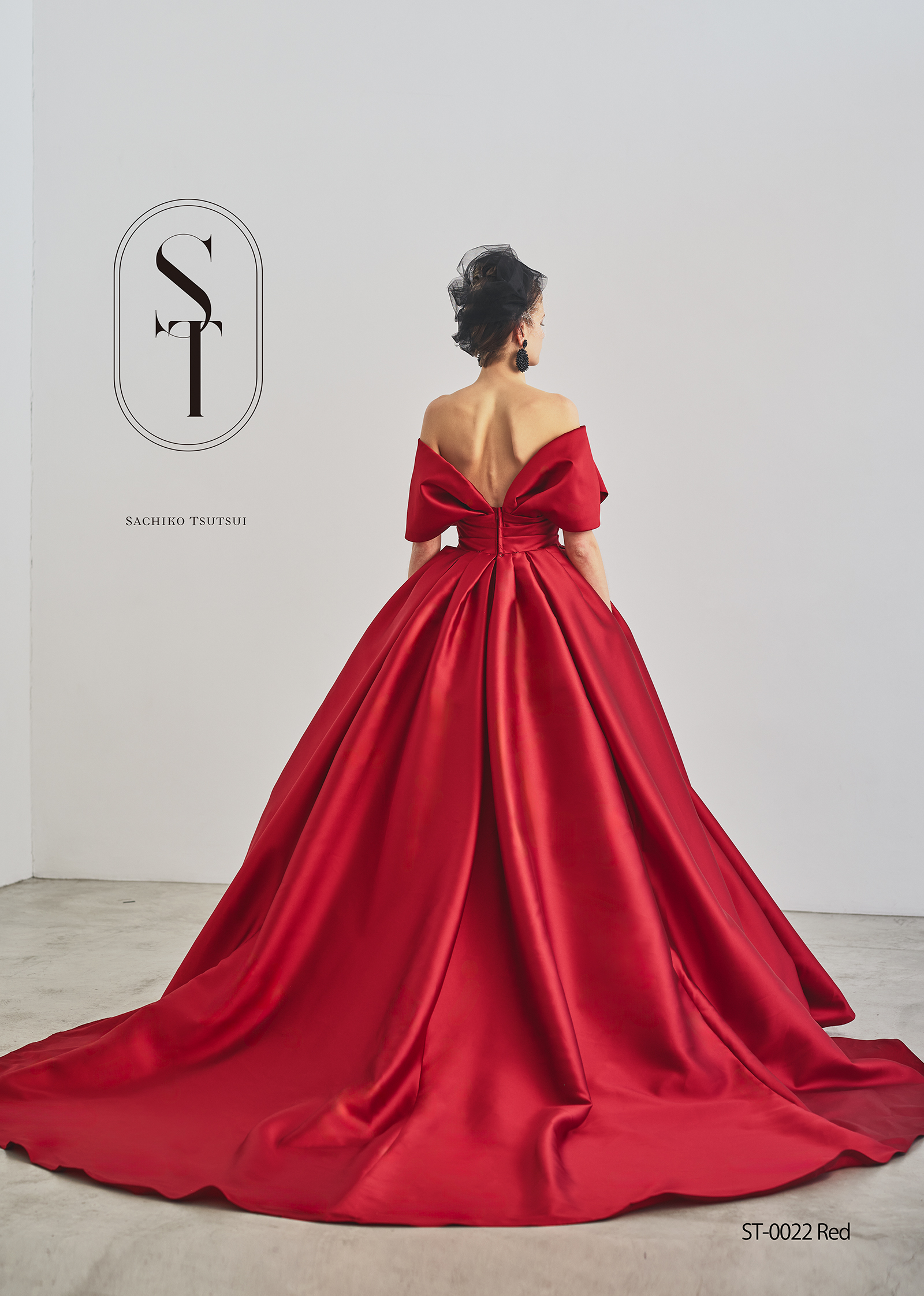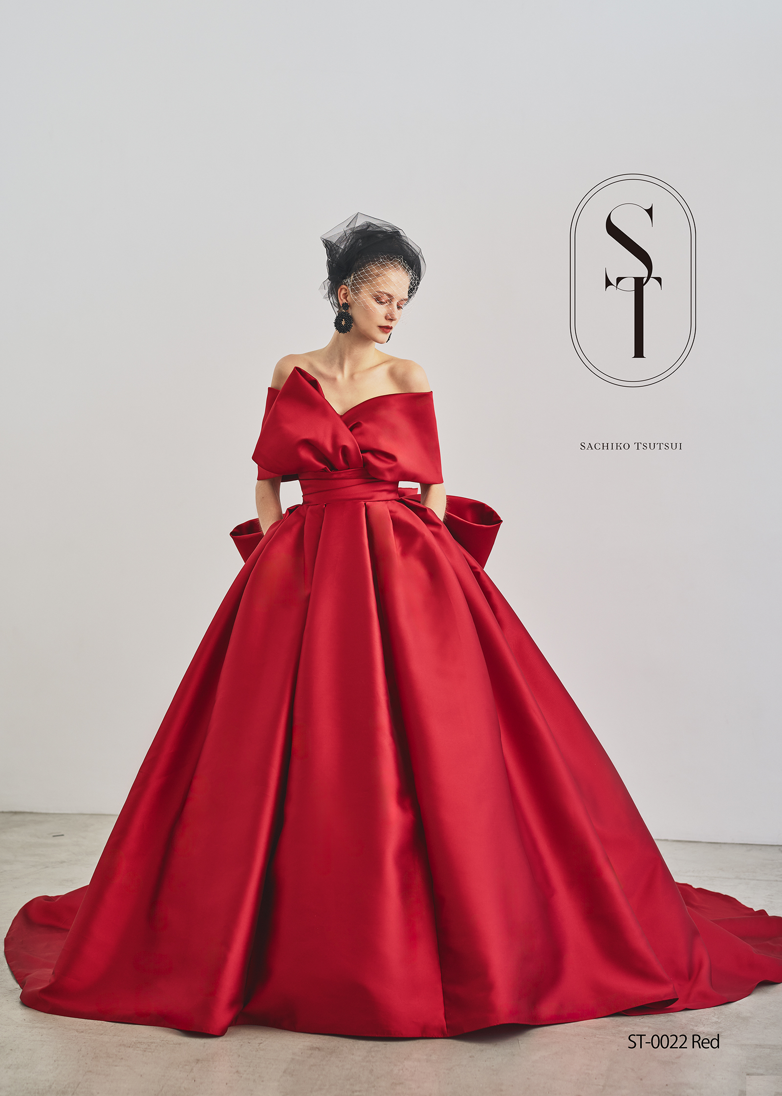 シルクタッチの上質な光沢感が美しいインポートミカドを使用し、身頃やバックスタイルの立体的なリボンが印象的。