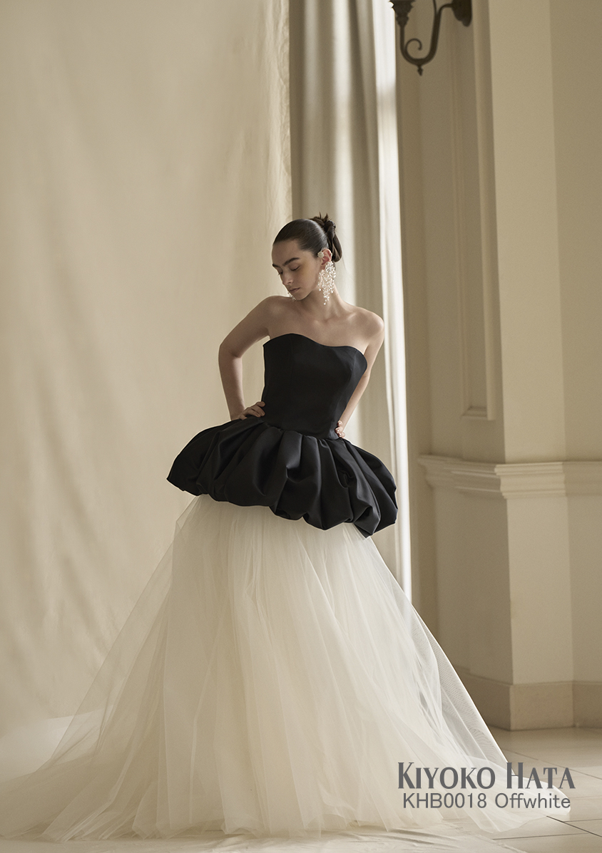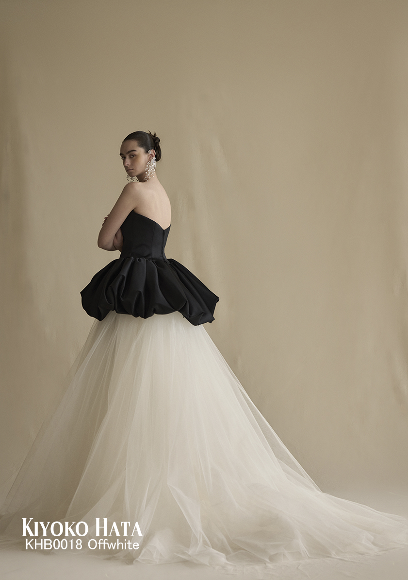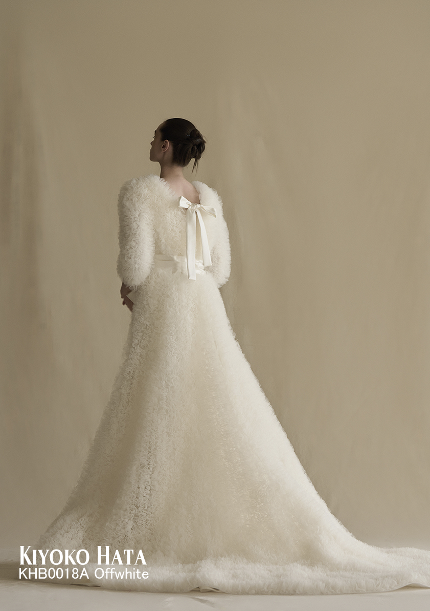 チュールのボリュームスカートを合わせることで洗練と遊び心が同居するデザインは、まとう人の内なる個性を、冷静に、静かに、そして鮮やかに引き立てます。