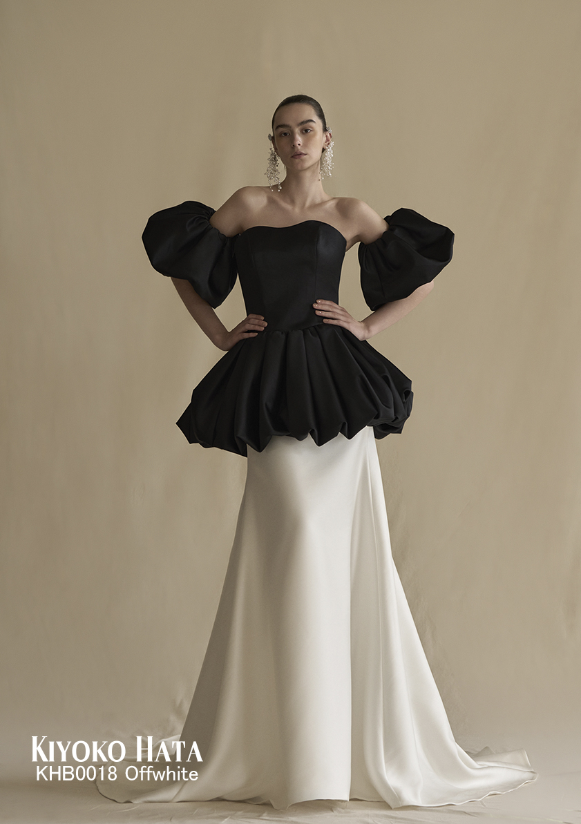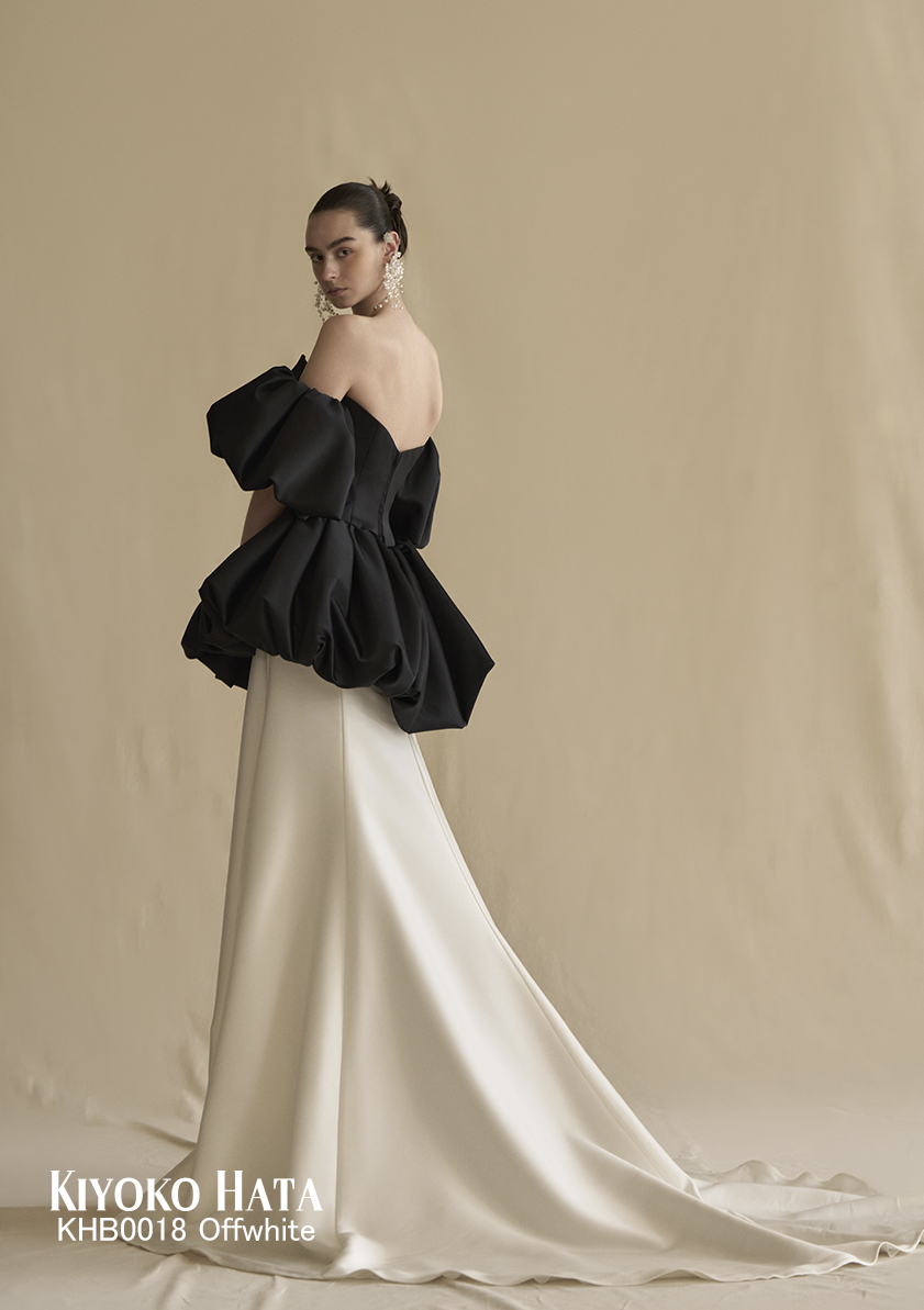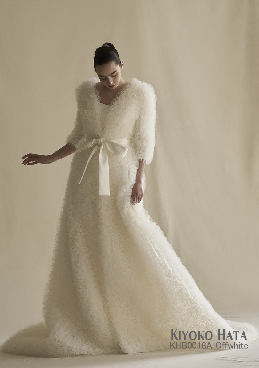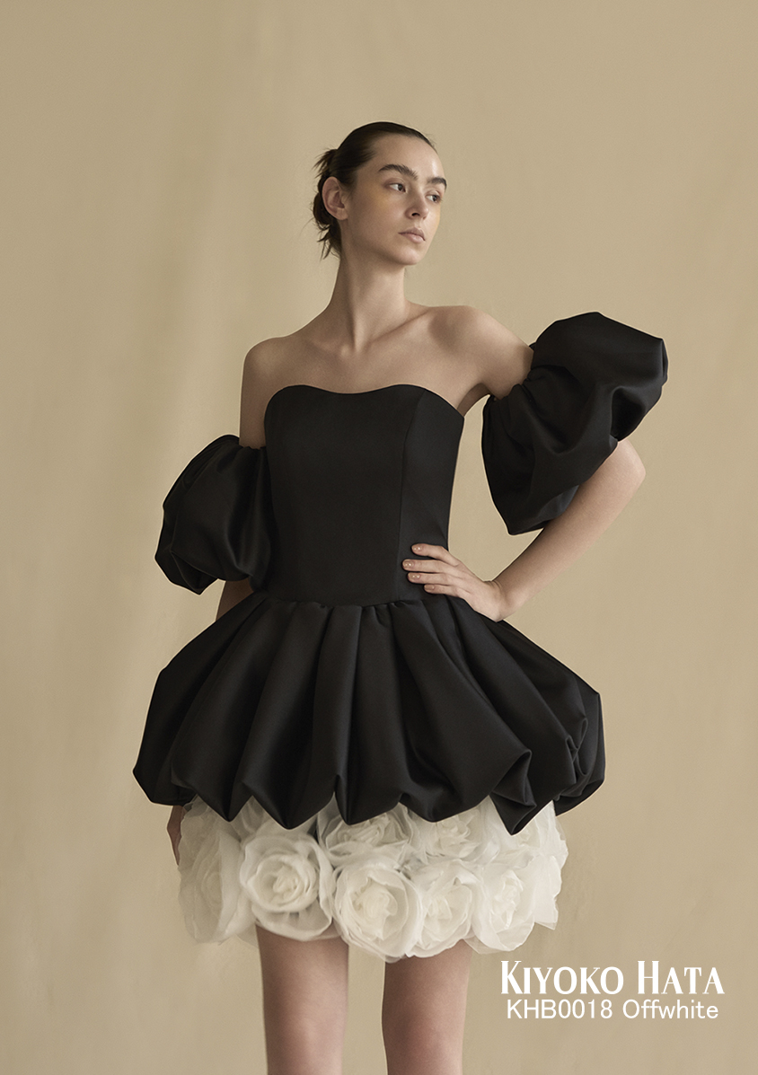 チュールのボリュームスカートを合わせることで洗練と遊び心が同居するデザインは、まとう人の内なる個性を、冷静に、静かに、そして鮮やかに引き立てます。